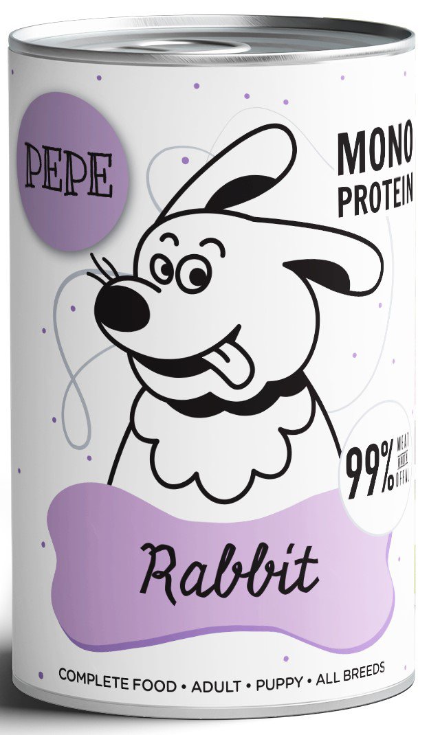 Skład: Królik 99% (w tym 71% mięso królika i podroby, 28% rosół z królika), minerały 1%