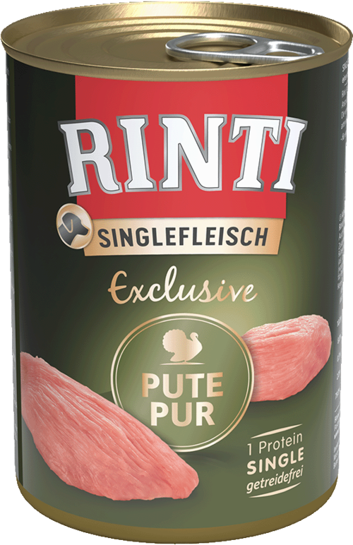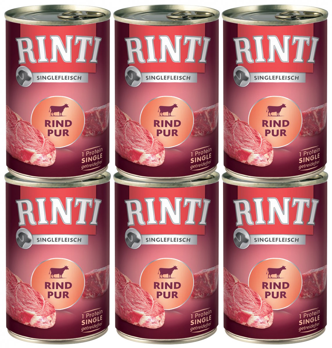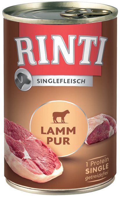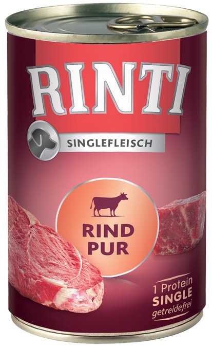 Mokra karma Rinti Sensible Pur bazuje na jednym rodzaju białka zwierzęcego.