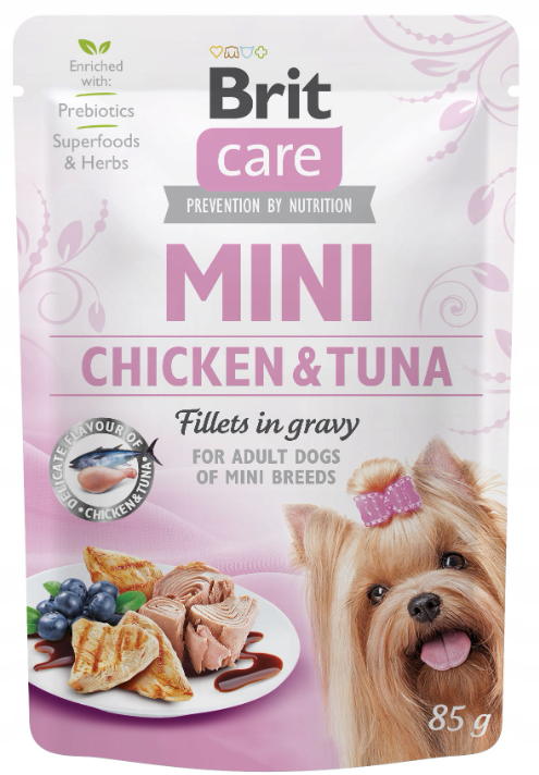 Pełnoporcjowa karma w postaci kawałków filetów mięsnych w delikatnym sosie własnym to idealnie zbilansowany posiłek dla psów ras miniaturowych oraz małych.