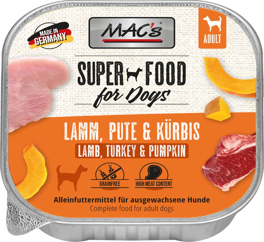Karma mokra MAC´s Dog Adult to wysokiej jakości pożywienie dla psów. Ich przewód pokarmowy przyzwyczajony jest do diety opartej głównie na czystym mięsie. Karma zawierająca zboże często wywołuje nietolerancje pokarmowe u zwierząt. Z tego powodu, posiłki MAC's są całkowicie pozbawione zbóż i soi. Duża zawartość delikatnego mięsa zapewnia wyśmienity smak i wysoką akceptację. W karmie nie występują połączone kawałki mięsne, ani mączka kostna czy zwierzęca, jej wysoką jakość zapewnia najlepsze mięso z serc, wątroby czy płuc. Karma nie zawiera sztucznych barwników, aromatów, oraz konserwantów. Witaminy i minerały ponadto wzbogacają zrównoważoną dietę Twojego psa.