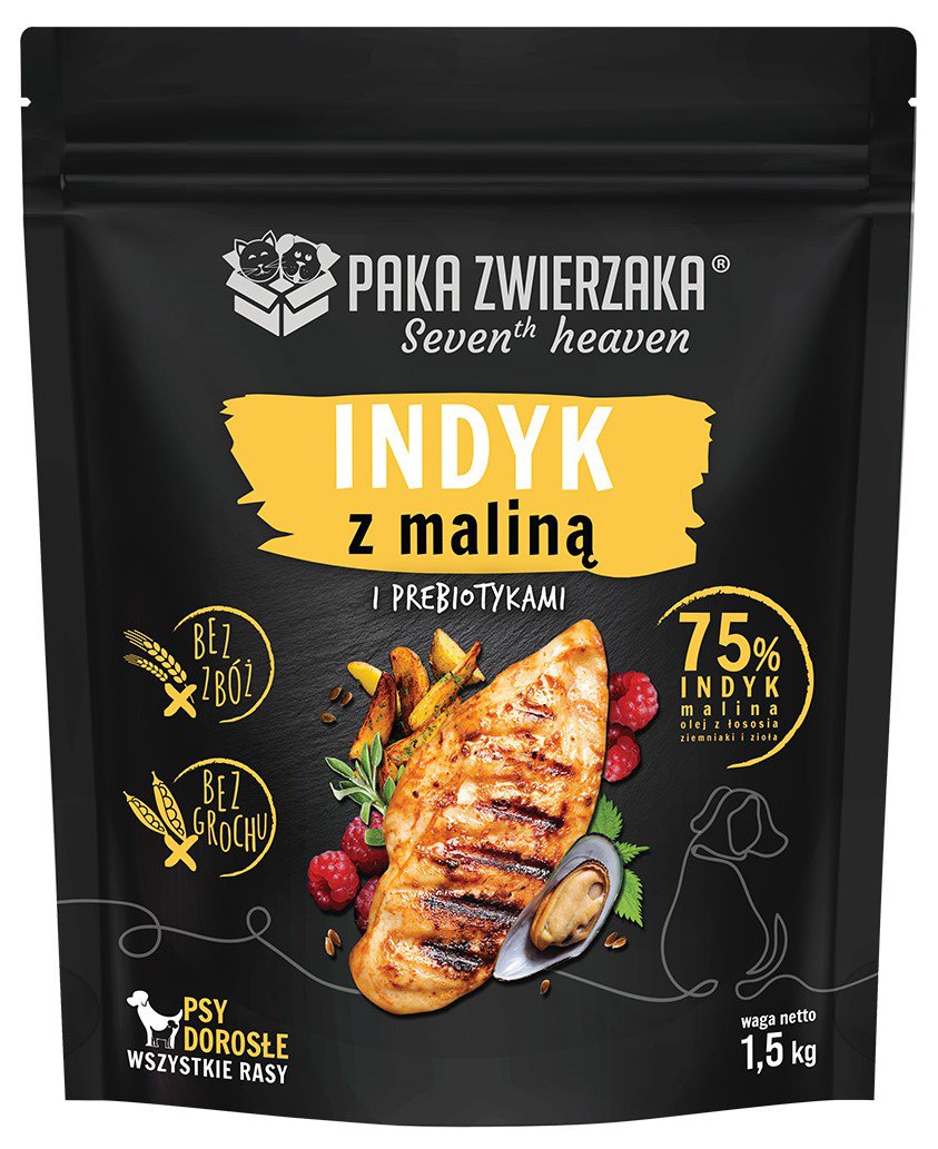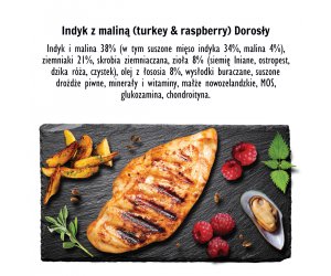 Najwyższej jakości mięso indyka, malin, warzyw i ziół pozyskiwane od lokalnych dostawców zapewnią wysoką smakowitość i łatwą przyswajalność. Idealna formuła dla psów z delikatnym żołądkiem i nietolerancją na zboża.