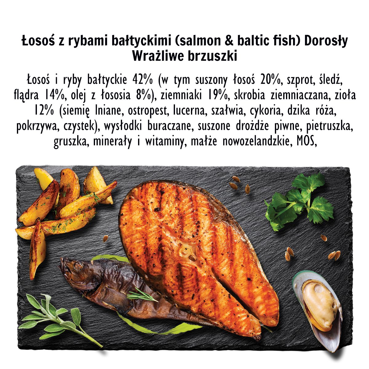 Skład: Łosoś i ryby bałtyckie 42% ( w tym suszony łosoś 20%, szprot, śledź, flądra 14%, olej z łososia 8%), ziemniaki 19%, skrobia ziemniaczana, zioła 12% (siemię lniane, ostropest, lucerna, szałwia, cykoria, dzika róża, pokrzywa, czystek), wysłodki buraczane, suszone drożdze piwne, pietruszka, gruszka, minerały i witaminy, małże nowozelandzkie, MOS, glukozamina, chondroityna