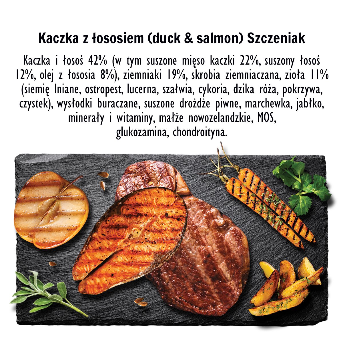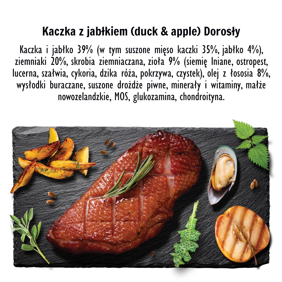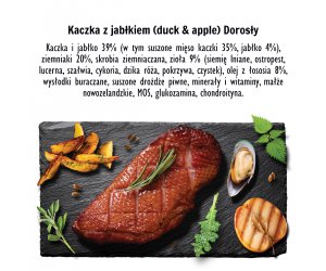 Skład: Kaczka i jabłko 39% ( w tym suszone mięso kaczki 35%, jabłko 4%), ziemniaki 20%, skrobia ziemniaczana, zioła 9% (siemię lniane, ostropest, lucerna, szałwia, cykoria, dzika róża, pokrzywa, czystek) olej z łososia 8%, wysłodki buraczane, suszone drożdze piwne, minerały i witaminy, małże nowozelandzkie, MOS, glukozamina, chondroityna.