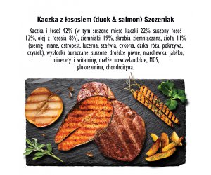 Skład: Kaczka i łosoś 42% ( w tym suszone mięso kaczki 22%, suszony łosoś 12%, olej z łososia 8%), ziemniaki 19%, skrobia ziemniaczana, zioła 11% (siemię lniane, ostropest, lucerna, szałwia, cykoria, dzika róża, pokrzywa, czystek), wysłodki buraczane, suszone drożdze piwne, marchewka, jabłko, minerały i witaminy, małże nowozelandzkie, MOS, glukozamina, chondroityna.