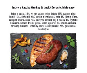 Najwyższej jakości mięso indyka, kaczki, warzyw i ziół pozyskiwane od lokalnych dostawców zapewnią wysoką smakowitość i łatwą przyswajalność. Idealna formuła dla psów z delikatnym żołądkiem i nietolerancją na zboża. Małe chrupki sprawdzą się dla psów małych ras.