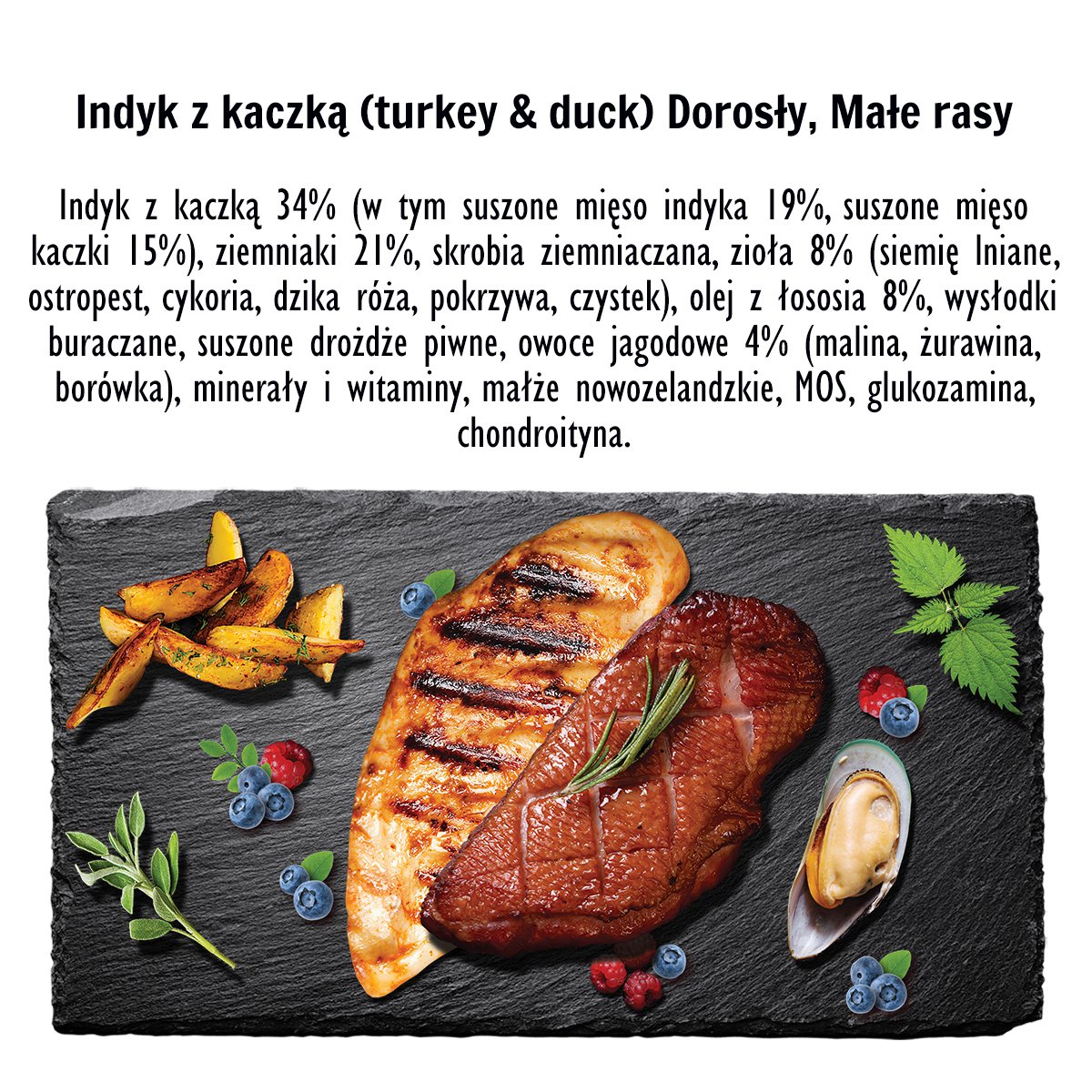 Skład: Indyk z kaczką 34% (w tym suszone mięso indyka 19%, suszone mięso kaczki 15%), ziemniaki 21%, skrobia ziemniaczana, zioła 8% (siemię lniane, ostropest, cykoria, dzika róża, pokrzywa, czystek), olej z łososia 8%, wysłodki buraczane, suszone drożdże piwne, owoce jagodowe 4% (malina, żurawina, borówka), minerały i witaminy, małże nowozelandzkie, MOS, glukozamina, chondroityna.