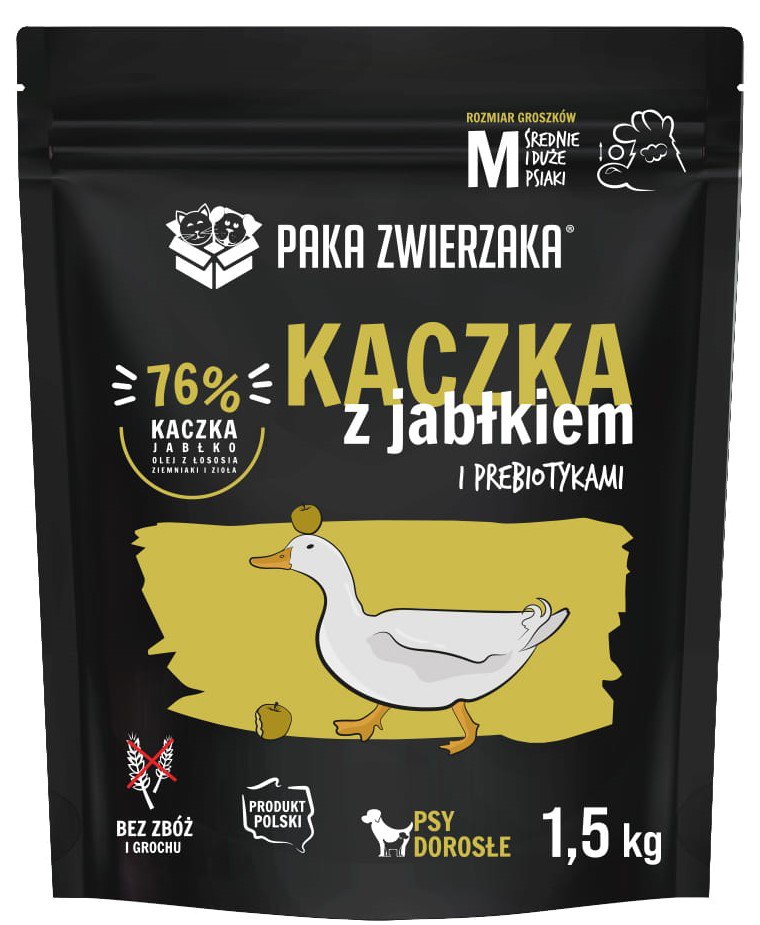 Najwyższej jakości mięso kaczki, jabłek, warzyw i ziół pozyskiwane od lokalnych dostawców zapewnią wysoką smakowitość i łatwą przyswajalność. Idealna formuła dla psów z delikatnym żołądkiem i nietolerancją na zboża.