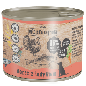 Skład: indyk 60%, brązowy ryż 20%, marchew 5%, groszek 5%, ziemniaki 5%, minerały, olej słonecznikowy, olej z łososia, suszone wodorosty morskie, cykoria, glukozamina HCl, chondroityna.