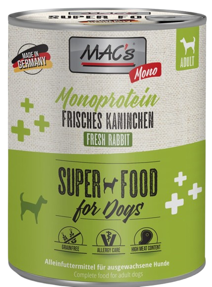 Mac's Dog Królik składa się wyłącznie z jednego źródła białka, Dzięki temu karma jest szczególnie odpowiednia dla psów z wrażliwym przewodem pokarmowym oraz z alergiami. Specjalna receptura jest wolna od zbóż oraz wysoce smakowita.