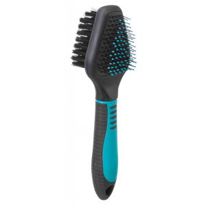 Szczotka z podwójnym włosiem to produkt umożliwiający delikatne rozczesywanie podszerstka psa. Umożliwiają to specjalne elastyczne igły, które zakończone zostały plastikowymi końcówkami aby zapewnić psu większy komfort podczas czesania. Nylonowe włosie użyte w szczotce usuwa martwy podszerstek oraz wygładza i pozostawia sierść lśniącą. Produkt idealny dla psów, które posiadają sierść średniej długości oraz długą.